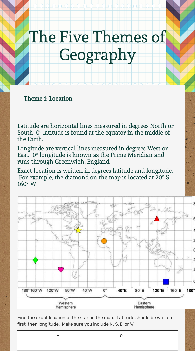 Five themes of geography answers worksheets learny kids. Geography online worksheet for 7th. The 5 themes of geography are used in social studies and history classes when discussing places, people, and events. Geographers use the 5 themes of geography to study and learn about the world they include location place human environment interaction movement regions. Looking for activities to teach the five themes of geography?